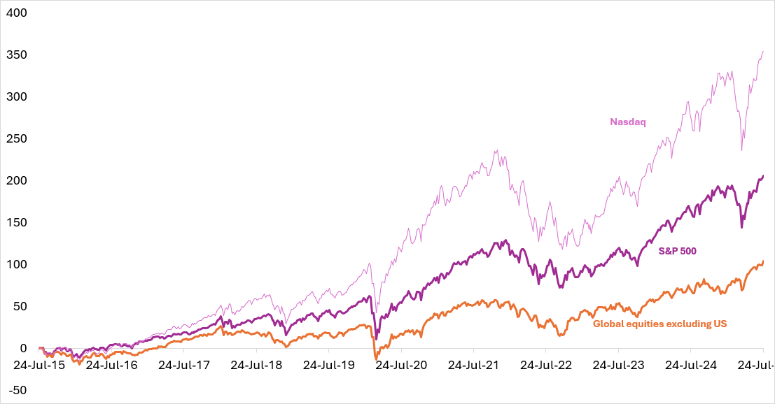 This concern is illustrated by the chart below, which compares the relative returns of the Nasdaq, S&P 500, and global equities excluding the US over the past decade. While US markets – particularly the so-called “Magnificent 7” tech stocks – have delivered exceptional returns, the gap has begun to narrow. The question many are now asking is: Are 10 years of exceptionalism coming to an end?