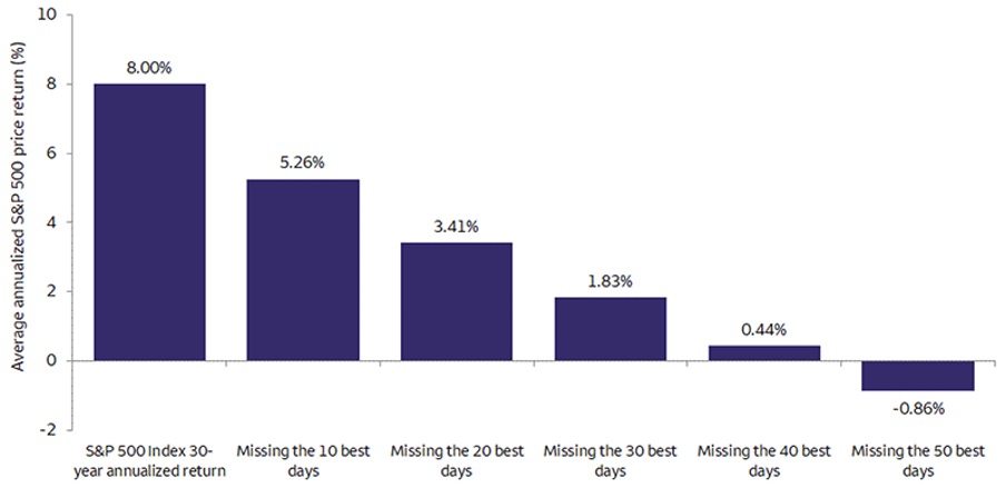 The perils of taking action for the sake of it are easy to demonstrate. The S&P 500 has delivered an average annualised return of 8% over the past 30 years, as figure 1 shows, but missing the market’s 10 best days during that period would have dropped the figure to just over 5%.